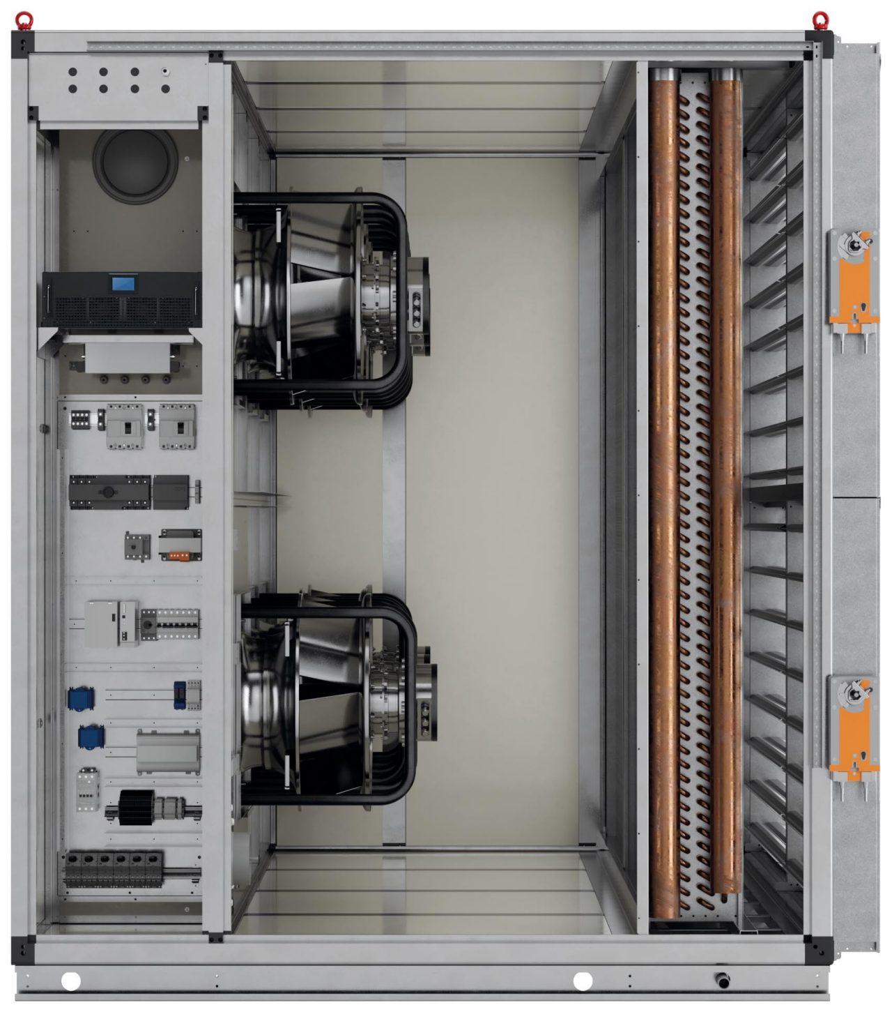 Air filters, control panel, UPS, fan array, cooling coil (up to 8 rows) and dampers are integrated according to your needs in an aluminium anodised profile casing on a hot deep galvanised base frame. The whole module is pre-tested and ready to use